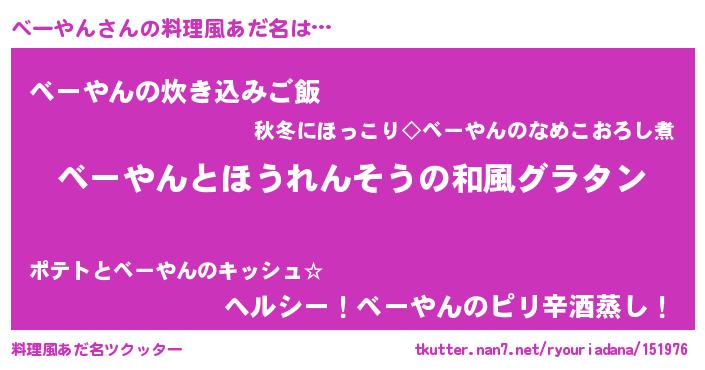 | 男性向けラノベタイトル風あだ名 | 『転生したらベーやんだった件』 |