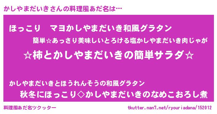 | ヘコむあだ名 | 『かしやまだいき(笑)』『かしぷりん』 |