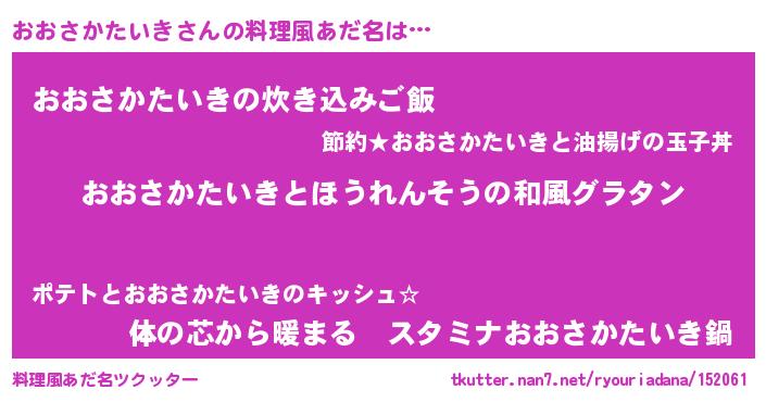 | 男性向けラノベタイトル風あだ名 | 『転生したらおおさかたいきだった件』 |