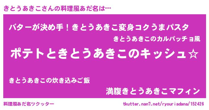 | 女子向けラノベタイトル風あだ名 | 『きとうあきこの卵を拾いまして』 |