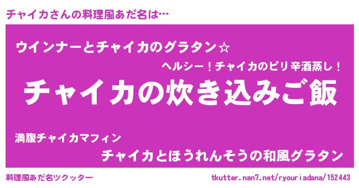 | 男性向けラノベタイトル風あだ名 | 『うちのチャイカが世界を掌握している!』 |