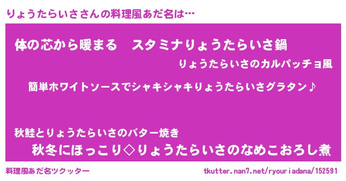 | ポケモン風あだ名 | 『ヒリョウタライサ』『リョウダネ』 |