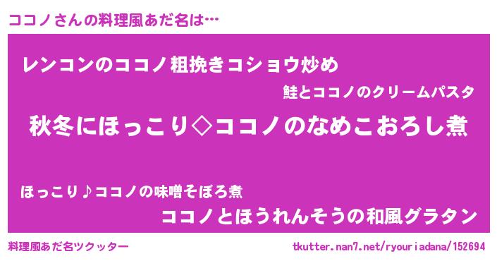 | ヒーロー風カッコイイあだ名 | 『究極戦士ココノ』『愛の使者ココノ』 |