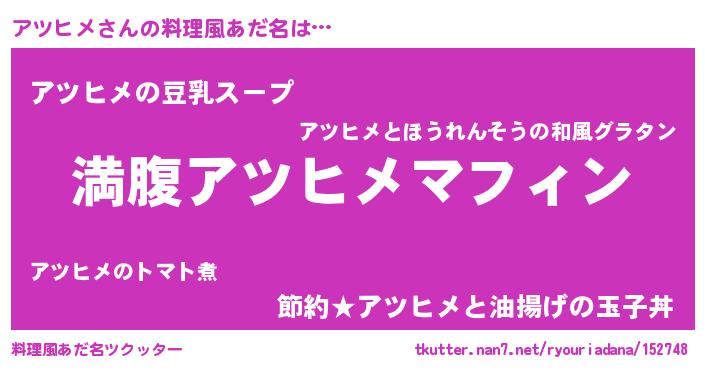 | 男性向けラノベタイトル風あだ名 | 『アツヒメという概念が存在しない退屈な世界 』 |