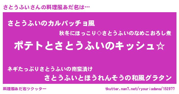 | 女子向けラノベタイトル風あだ名 | 『さとうふいの卵を拾いまして』 |