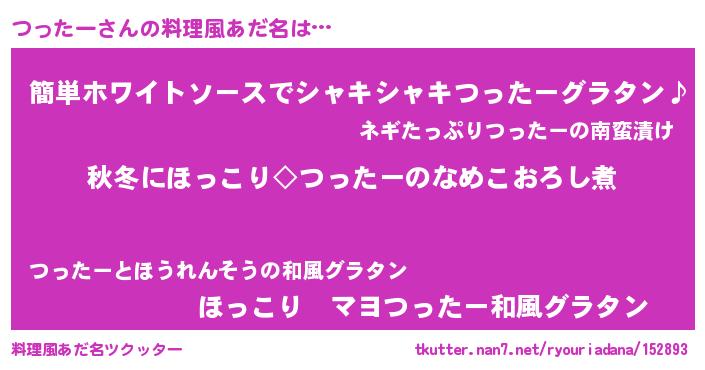 | 男性向けラノベタイトル風あだ名 | 『つったーに滅ぼされるだけの簡単なお仕事です』 |