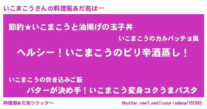 | 男性向けラノベタイトル風あだ名 | 『Re:いこまこうから始める異世界生活』 |