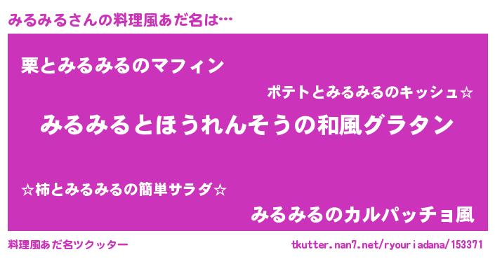 | 女子向けラノベタイトル風あだ名 | 『みるみるの玉の輿計画!』 |
