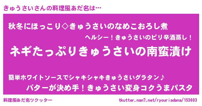 | 意味不明あだ名 | 『ペロリンきゅうさい』『自称きゅうさい』 |