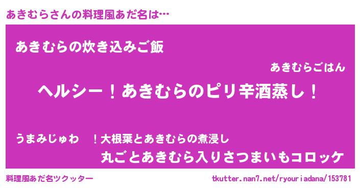 | 男性向けラノベタイトル風あだ名 | 『Re:あきむらから始める異世界生活』 |