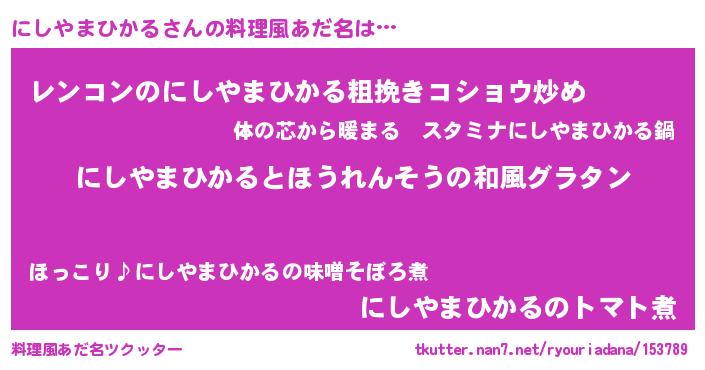 | 男性向けラノベタイトル風あだ名 | 『にしやまひかる~年齢イコール彼女いない歴の魔法使い~』 |