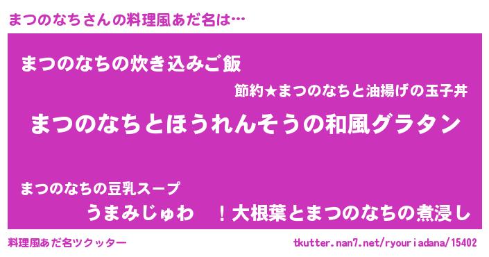 | 女子向けラノベタイトル風あだ名 | 『まつのなちの玉の輿計画!』 |