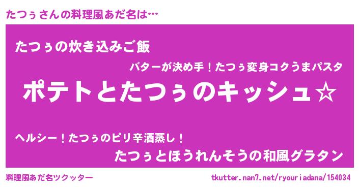 | 女子向けラノベタイトル風あだ名 | 『たつぅの卵を拾いまして』『闇のたつぅ』 |