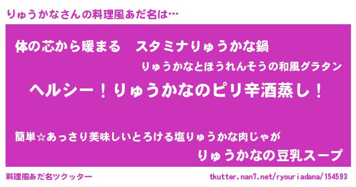 | 男性向けラノベタイトル風あだ名 | 『Re:りゅうかなから始める異世界生活』 |
