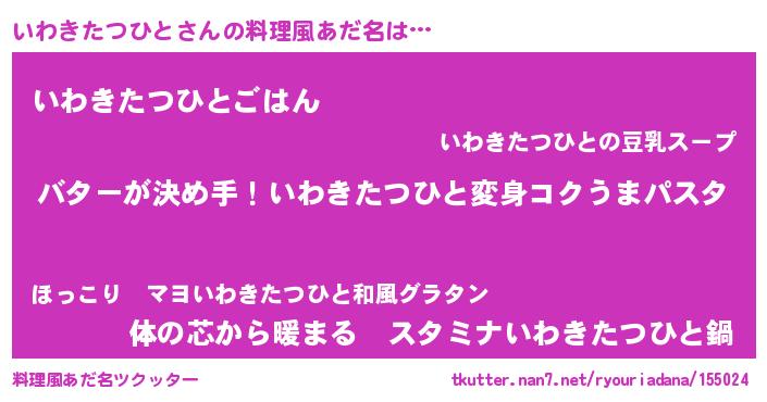 | 男性向けラノベタイトル風あだ名 | 『おまえをオタクにしてやるから、俺をいわきたつひとにしてくれ! 』 |