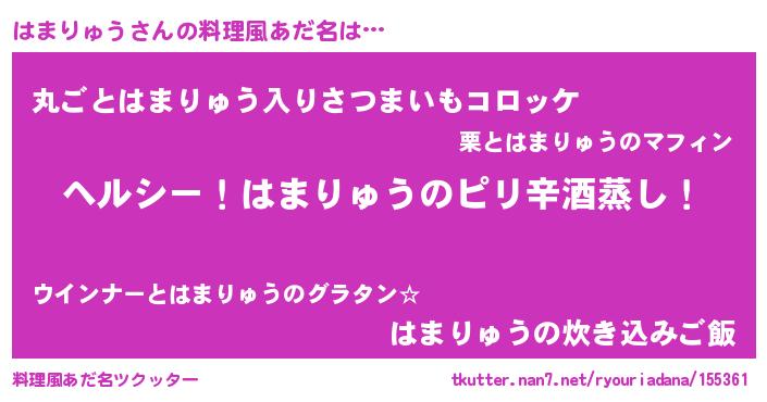 | 男性向けラノベタイトル風あだ名 | 『Re:はまりゅうから始める異世界生活』 |