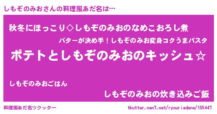 | 男性向けラノベタイトル風あだ名 | 『しもぞのみおの嫁は女の子じゃないと思った?』 |