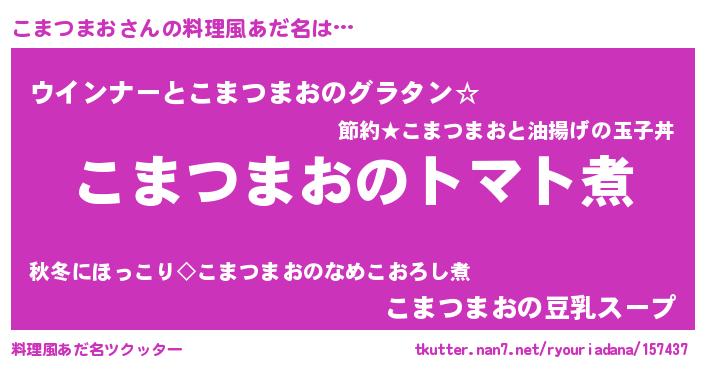 | 男性向けラノベタイトル風あだ名 | 『おまえをオタクにしてやるから、俺をこまつまおにしてくれ! 』 |