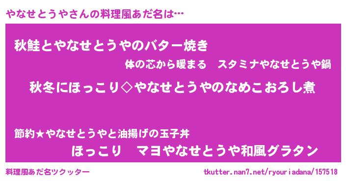 | ヘコむあだ名 | 『やなせとうや(笑)』『酢こんぶ』 |