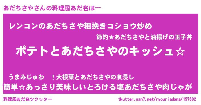| 女子向けラノベタイトル風あだ名 | 『あだちさやの卵を拾いまして』 |