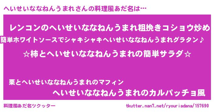 | 男性向けラノベタイトル風あだ名 | 『冴えないへいせいななねんうまれの育てかた』 |