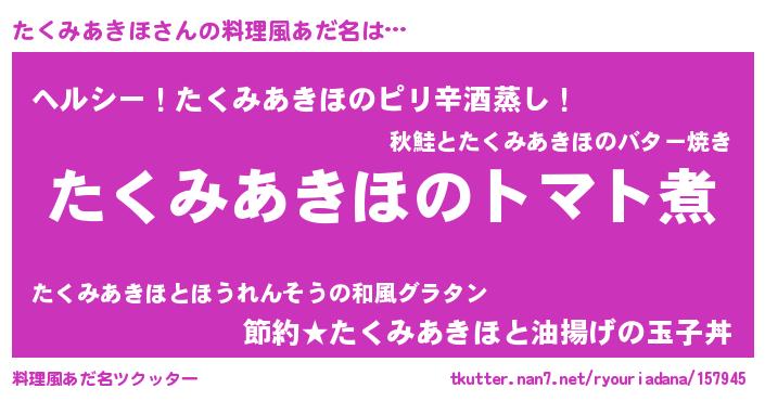 | ヘコむあだ名 | 『たくふぇ~』『たくみあきほ(小並感)』 |