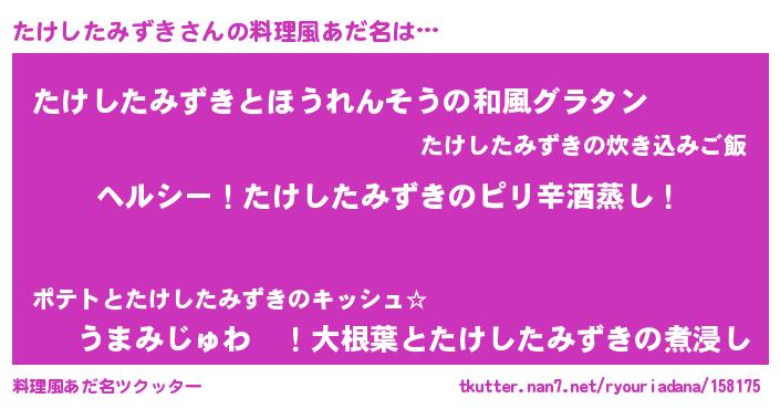 | 男性向けラノベタイトル風あだ名 | 『Re:たけしたみずきから始める異世界生活』 |