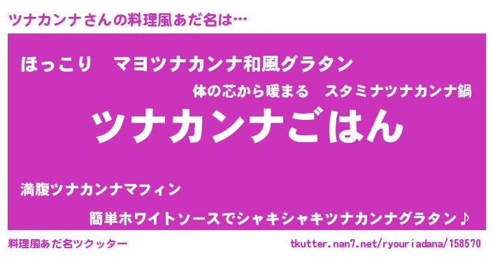 | 男性向けラノベタイトル風あだ名 | 『ツナカンナスレイヤー』 |
