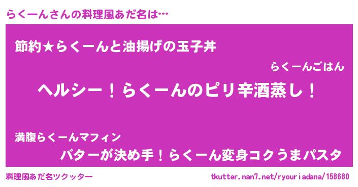 | 男性向けラノベタイトル風あだ名 | 『Re:らくーんから始める異世界生活』 |