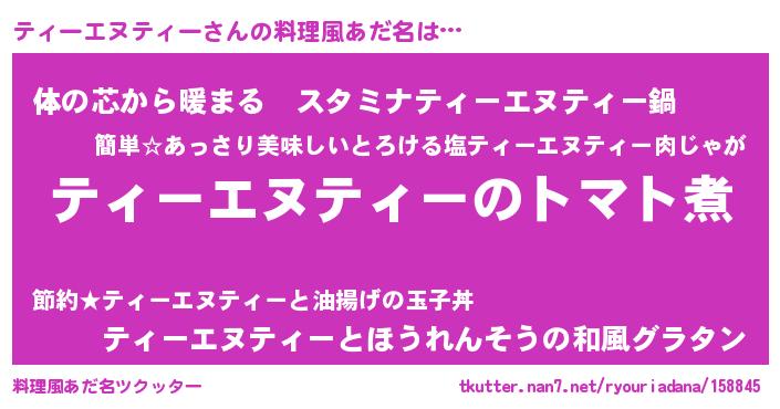 | 男性向けラノベタイトル風あだ名 | 『おまえをオタクにしてやるから、俺をティーエヌティーにしてくれ! 』 |
