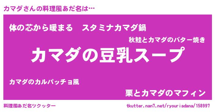 | ヒーロー風カッコイイあだ名 | 『暗黒騎士カマ』『ウルトラカマダマン』 |