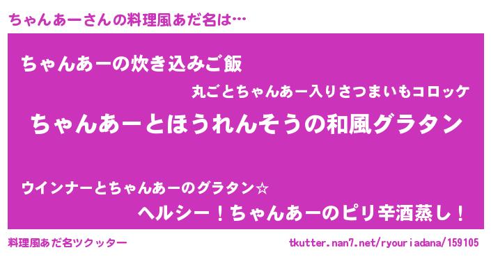 | 男性向けラノベタイトル風あだ名 | 『ちゃんあー~年齢イコール彼女いない歴の魔法使い~』 |