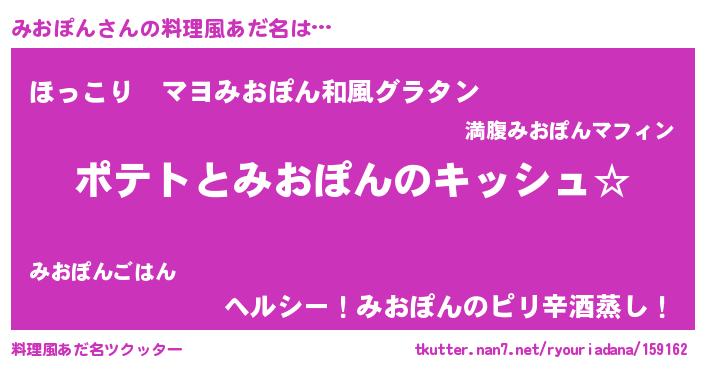| 女子向けラノベタイトル風あだ名 | 『みおぽんの卵を拾いまして』 |