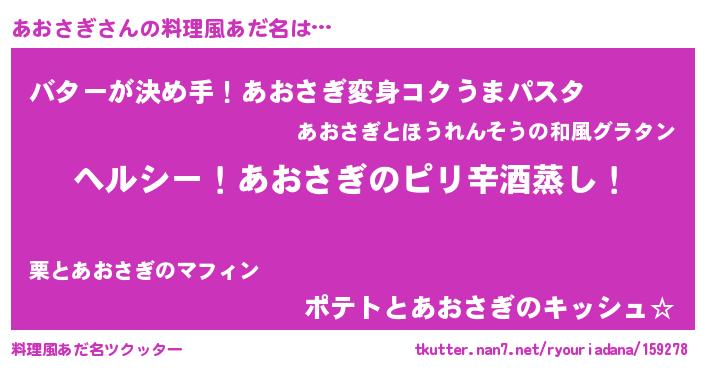 | 男性向けラノベタイトル風あだ名 | 『Re:あおさぎから始める異世界生活』 |