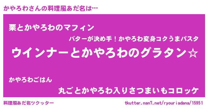 | 女子向けラノベタイトル風あだ名 | 『かやろわ伯爵の花嫁』『かやろわ恋絵巻』 |