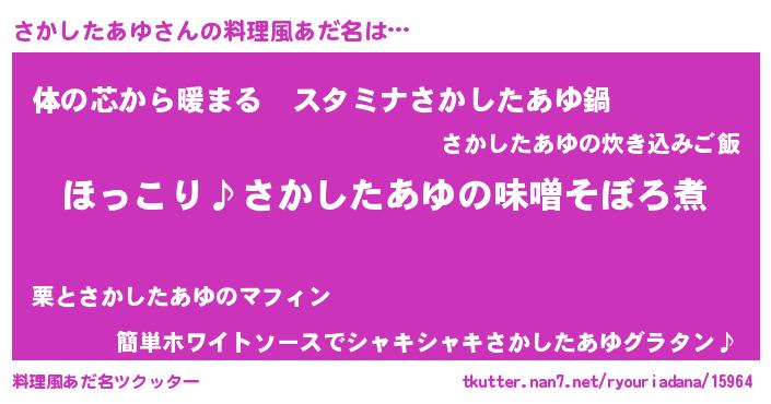 | 胡散臭い通販商品みたいなあだ名 | 『必ず成功するブレスレット…その名も「さかしたあゆ」』 |