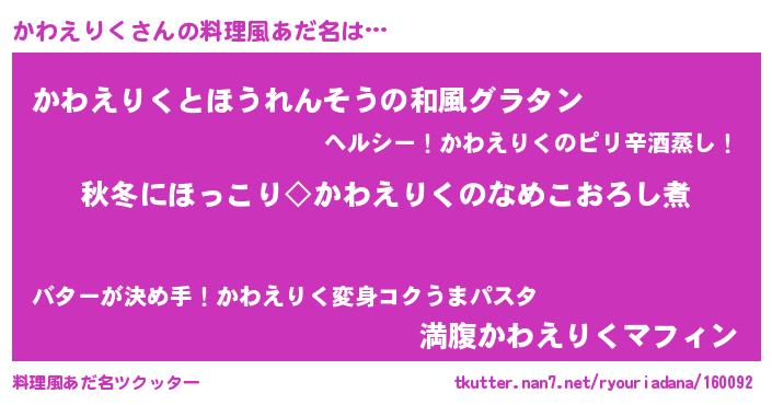 | 胡散臭い通販商品みたいなあだ名 | 『前代未聞の健康食品…その名も「かわえりく」』 |