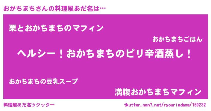| 男性向けラノベタイトル風あだ名 | 『Re:おかちまちから始める異世界生活』 |