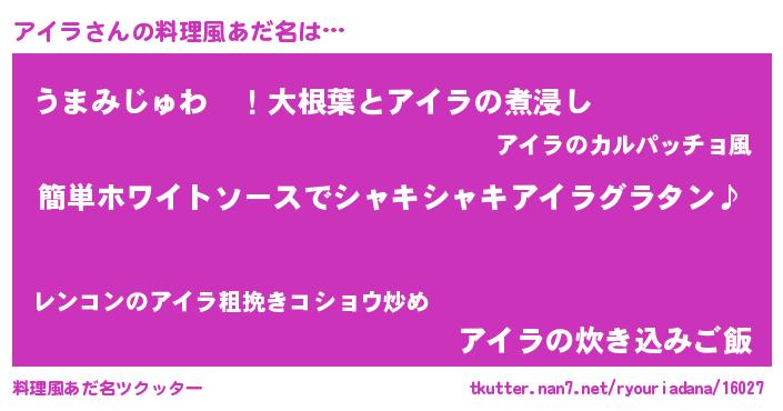 | 男性向けラノベタイトル風あだ名 | 『アイラの嫁は女の子じゃないと思った?』 |