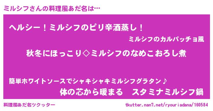 | ヘコむあだ名 | 『なまこ酢』『ミルっぺ』『ミルもー』 |