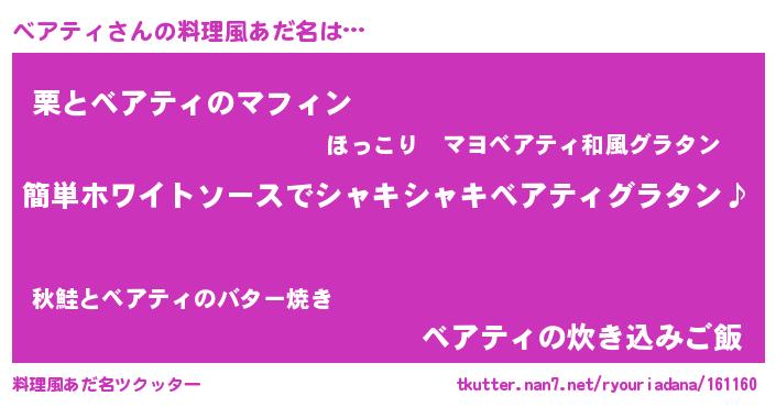 | 男性向けラノベタイトル風あだ名 | 『ベアティの嫁は女の子じゃないと思った?』 |
