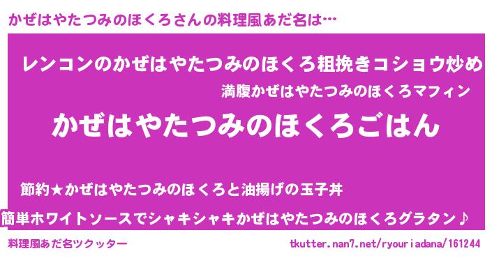 | 男性向けラノベタイトル風あだ名 | 『カゼハヤタツミノホクロスレイヤー』 |