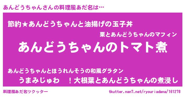 | 男性向けラノベタイトル風あだ名 | 『おまえをオタクにしてやるから、俺をあんどうちゃんにしてくれ! 』 |