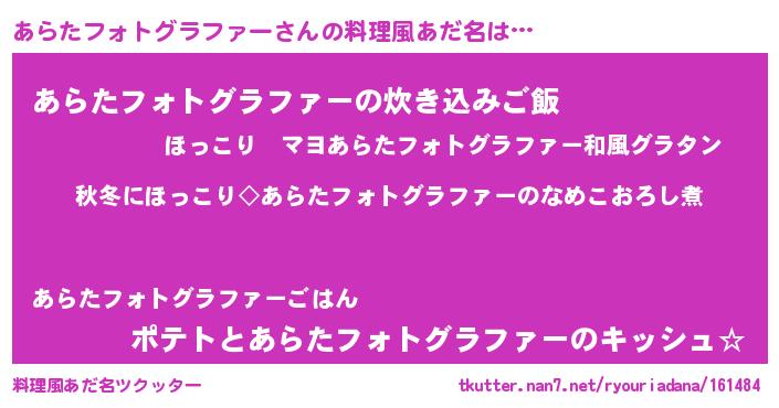 | 男性向けラノベタイトル風あだ名 | 『あらたフォトグラファーに滅ぼされるだけの簡単なお仕事です』 |