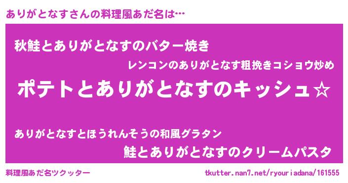 | 男性向けラノベタイトル風あだ名 | 『ありがとなすの嫁は女の子じゃないと思った?』 |
