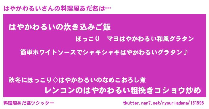 | 男性向けラノベタイトル風あだ名 | 『はやかわるいの嫁は女の子じゃないと思った?』 |