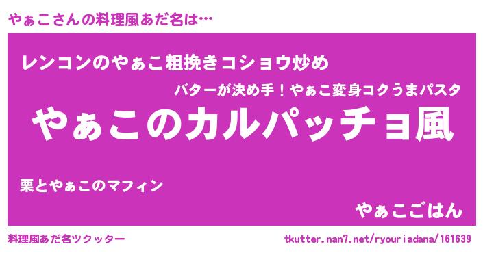 | 男性向けラノベタイトル風あだ名 | 『魔弾の王とやぁこ』『ヤァコスレイヤー』 |