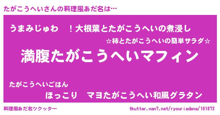 | 胡散臭い通販商品みたいなあだ名 | 『絶対に幸福をもたらす水素水…その名も「たがこうへい」』 |