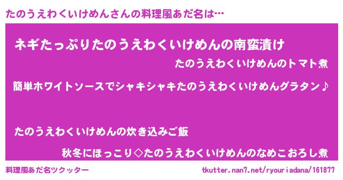 | 男性向けラノベタイトル風あだ名 | 『たのうえわくいけめんの嫁は女の子じゃないと思った?』 |