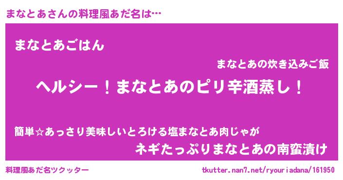 | 男性向けラノベタイトル風あだ名 | 『Re:まなとあから始める異世界生活』 |
